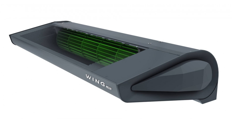 Kurtyna powietrza WING o szerokości 100cm, 150cm lub 200cm. Występująca w wariantach z nagrzewnicą wodną lub elektryczną oraz bez nagrzewnicy. Dostępna kolorystyka: biała (RAL9016) oraz szara (RAL7016).