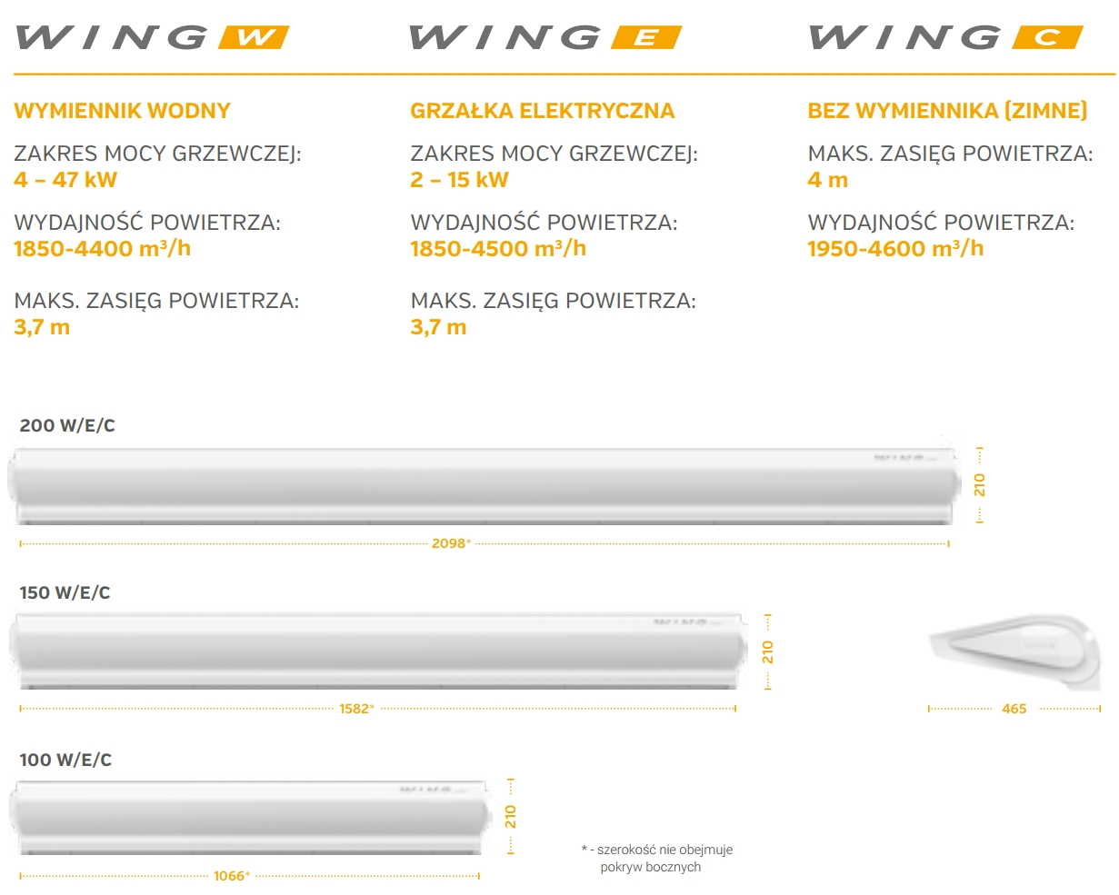 Kurtyna powietrza WING o szerokości 100cm, 150cm lub 200cm. Występująca w wariantach z nagrzewnicą wodną lub elektryczną oraz bez nagrzewnicy. Dostępna kolorystyka: biała (RAL9016) oraz szara (RAL7016).