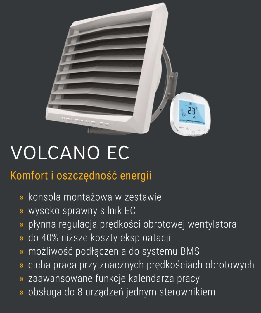 Nagrzewnica wodna VOLCANO to urządzenie służące do ogrzewania małych, średnich i wielkokubaturowych pomieszczeń. VOLCANO to urządzenia kompaktowe, gotowe do uruchomienia i proste w montażu i codziennej obsłudze.
